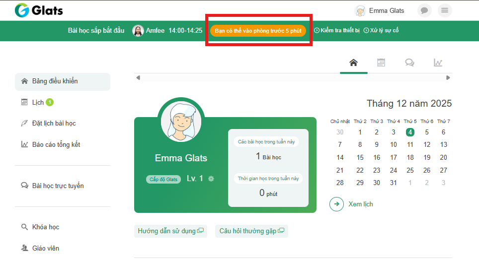 Đến giờ học, bạn có thể bắt đầu bài học bằng cách nhấn nút ở đầu trang web.